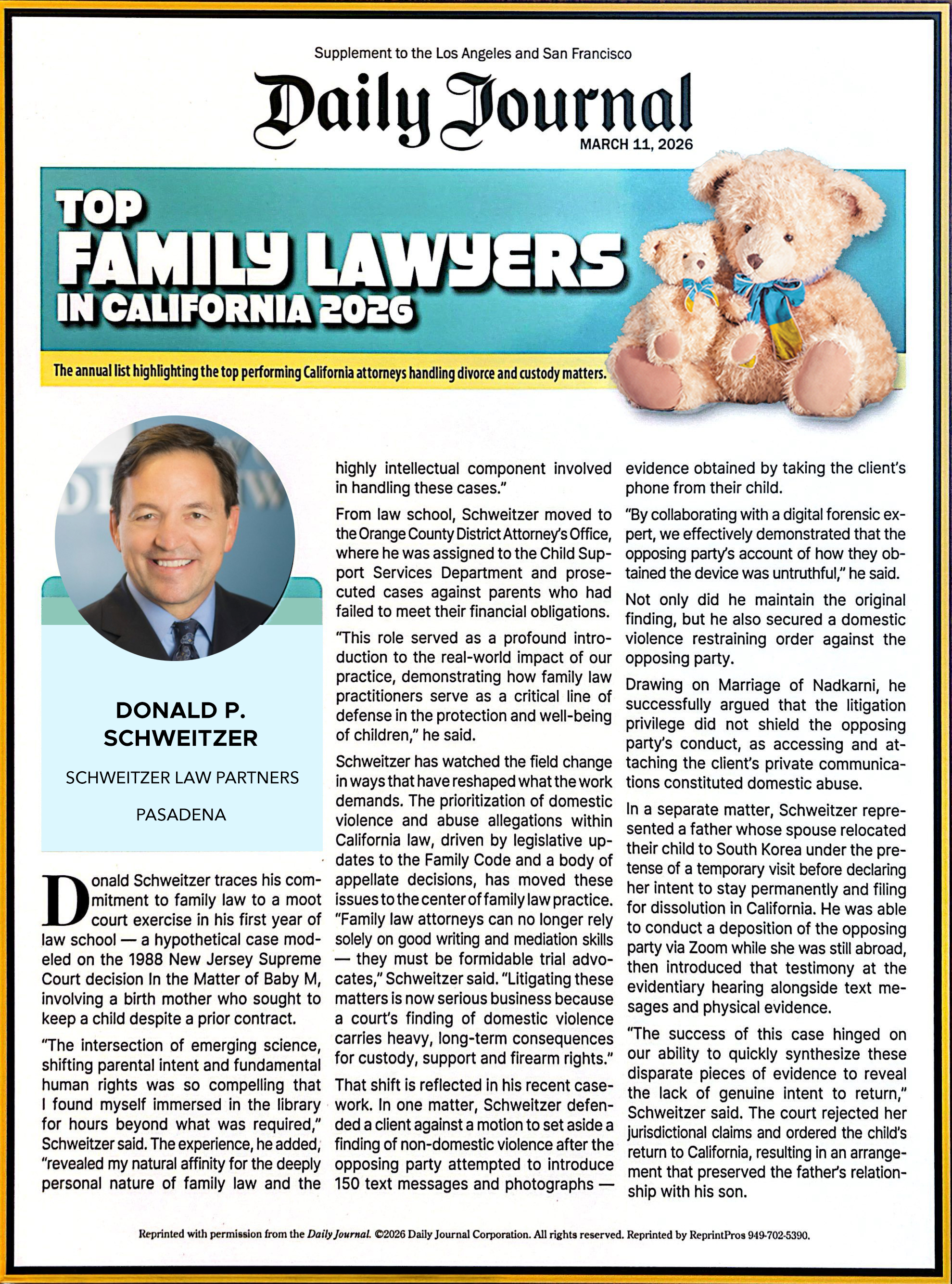 Donald P. Schweitzer is a Certified Family Law Specialist with over 30 years of trial experience. He is the Founder and Managing Partner of Pasadena's premier family law firm: Schweitzer Law Partners and is one of the most respected in the Los Angeles area. Attorney Schweitzer specializes in all matters of family law, including divorce, child custody, and domestic violence. He prides himself on providing excellent legal representation to his clients in all situations.